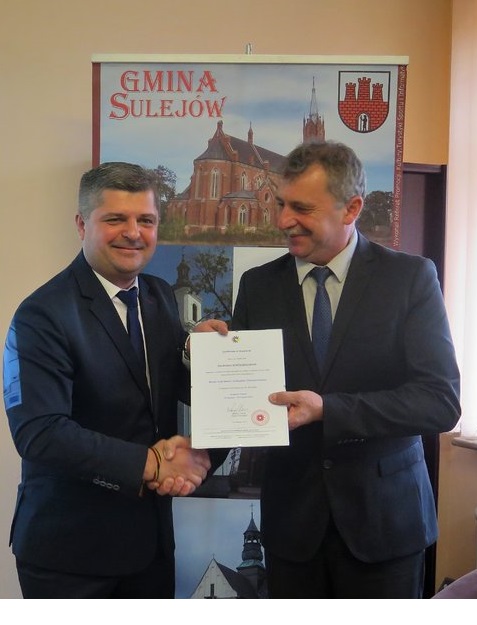 Na zdjęciu Wojciech Ostrowski, burmistrz Sulejowa, odbierający nominację dla organizatora z rąk Wojciecha Stempurskiego, prezesa Zarządu Polskiego Związku Sportu Niesłyszących.